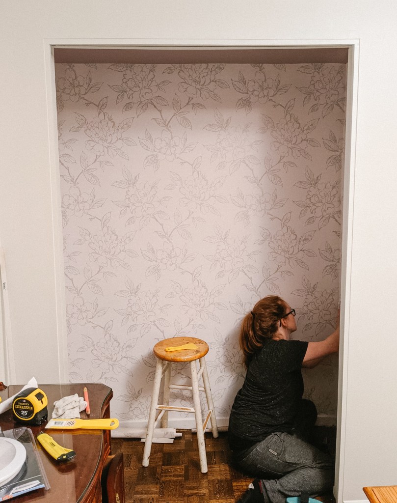 I knew the closet needed some work to make my vision come true. I attempted wallpapering for the first time in there. I figured not many people would see the inside of our closet so it wouldn’t matter if it wasn’t perfect. It turned out so beautifully that I almost didn’t want to cover it with the closet organizer and all of our clothes.
