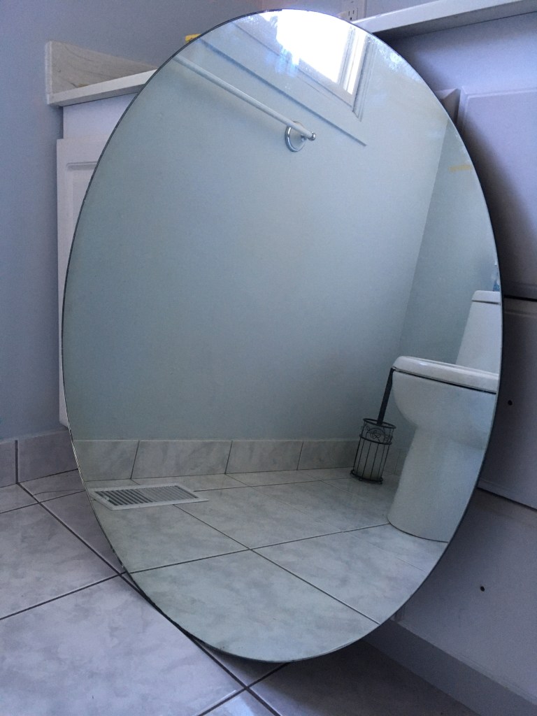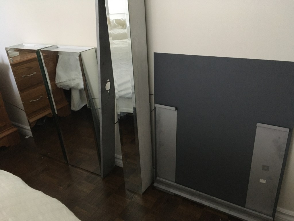 I needed Dan’s help to take the mirror unit down carefully. It didn’t come down in one piece as I had expected though and now I’m not sure how to sell it as I think professionals must’ve done the original installation. We may find a place for it elsewhere in our house or donate it once that becomes possible again.