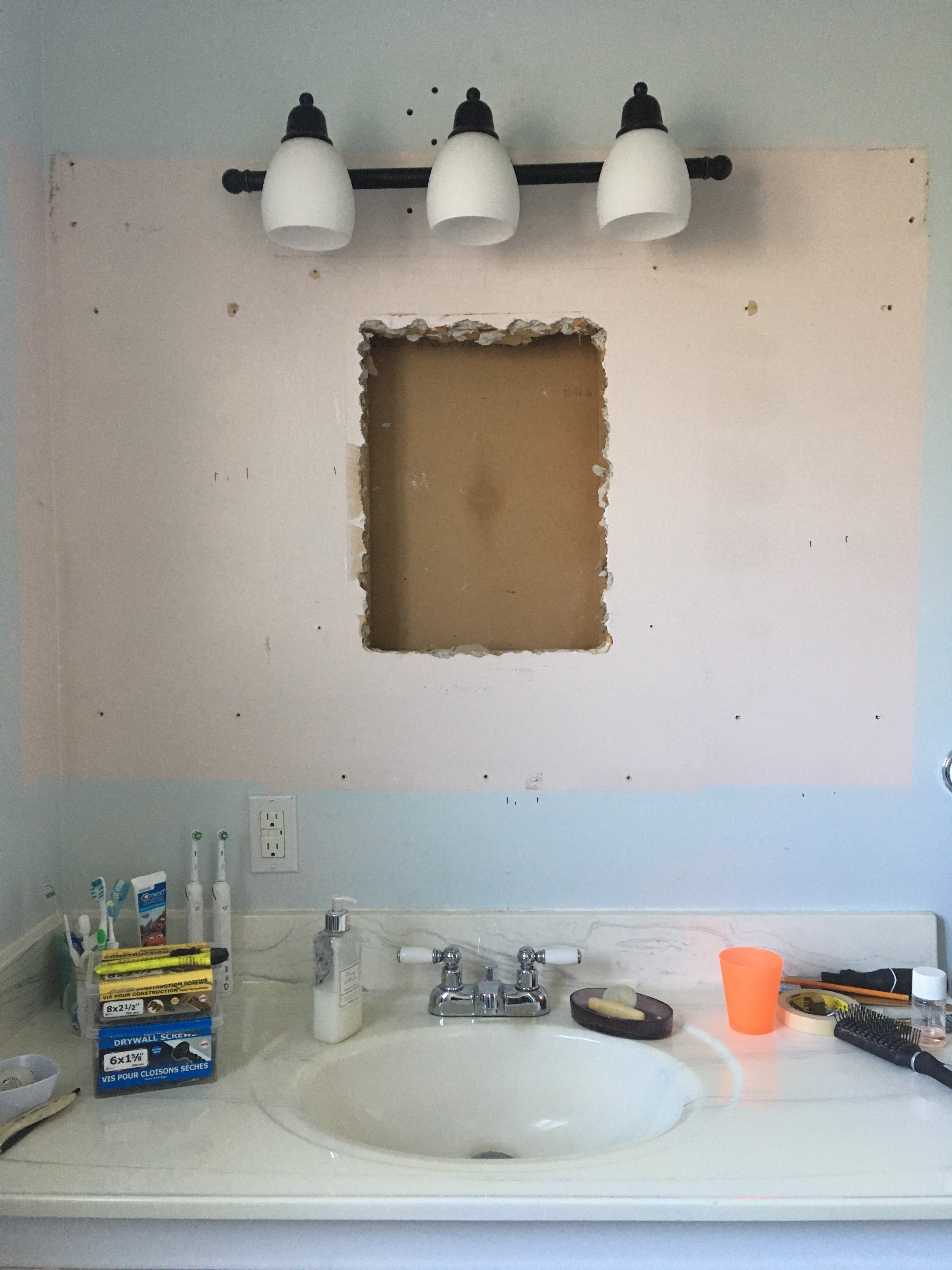 We also uncovered a hole in the wall that must’ve been for a medicine cabinet in the past. I was contemplating making a similar hole further down the wall to potentially make a hidden medicine cabinet with a framed piece of art. Seeing this hole had me reconsider the design I had in mind and I think I may have found an even better option than having a hinged door. I’m still mulling that one over though. Stay tuned!