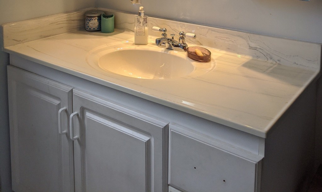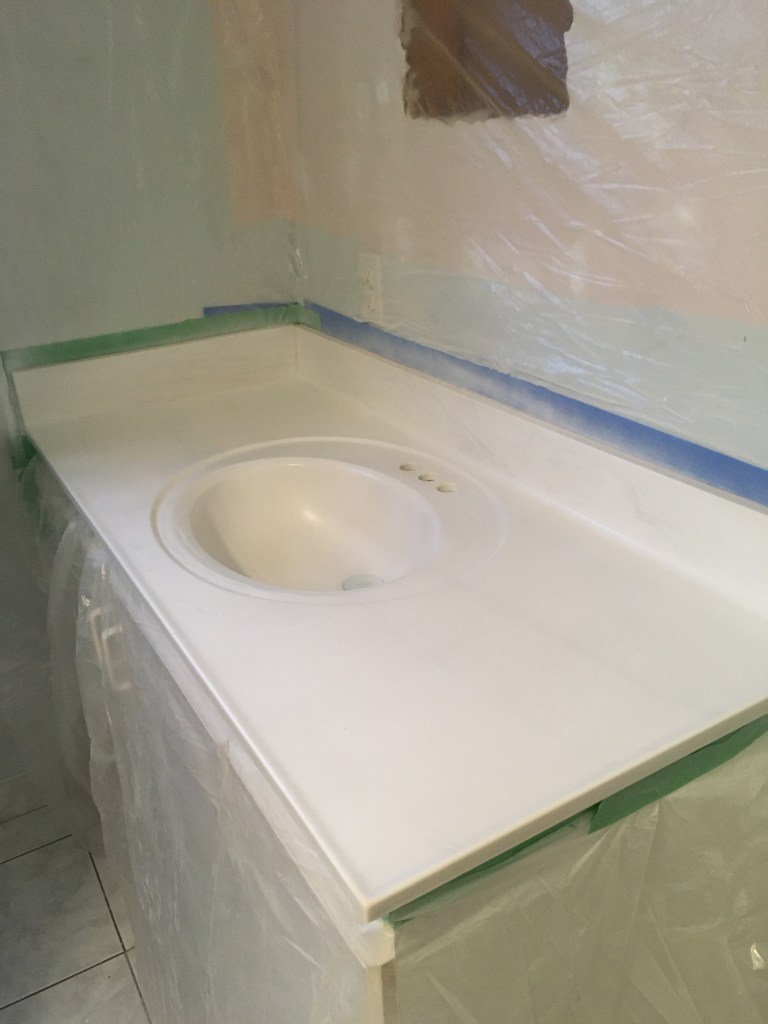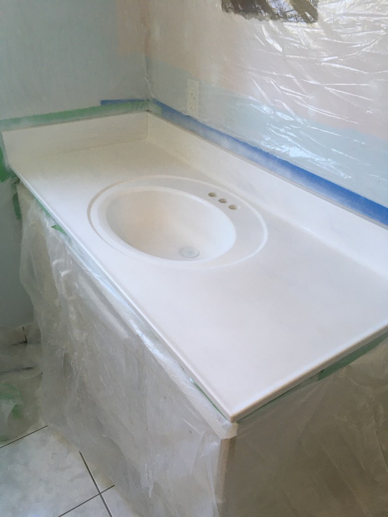 The vanity counter top and tub surround had seen better days. The marbled look wasn’t too bad but the yellow undertone simply had to go.