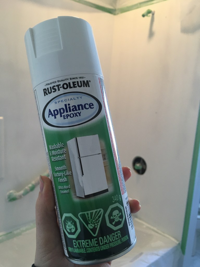 He did what he could with the paint we had but we needed more to finish the job evenly. I knew this might happen as most of the videos I saw of those going through the same process needed 2 kits as well. he went out to grab more at the hardware store and called me to tell me my options. A Rustoleum kit was going to cost around $60 CDN! That would take quite a chunk out of my budget and we didn’t need THAT much to finish the job. Then he told me the spray version cost $28 CDN at that particular store (more than what I had paid before elsewhere)! He was optimistic about Rustoleum Appliance Epoxy as it seemed like a similar product but only $11 CDN! I was hesitant to switch products at this point anyway; what if the colour is a bit off and it’s a different white?! But since this is all a big experiment anyway, I figured what the heck. let’s give it a shot!