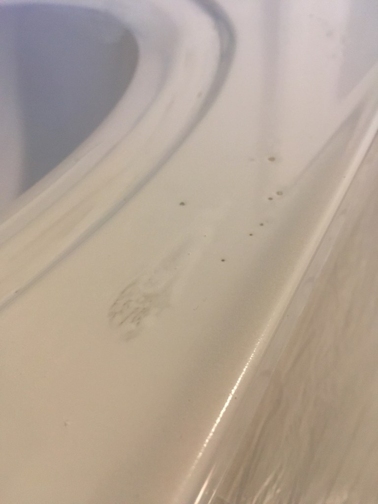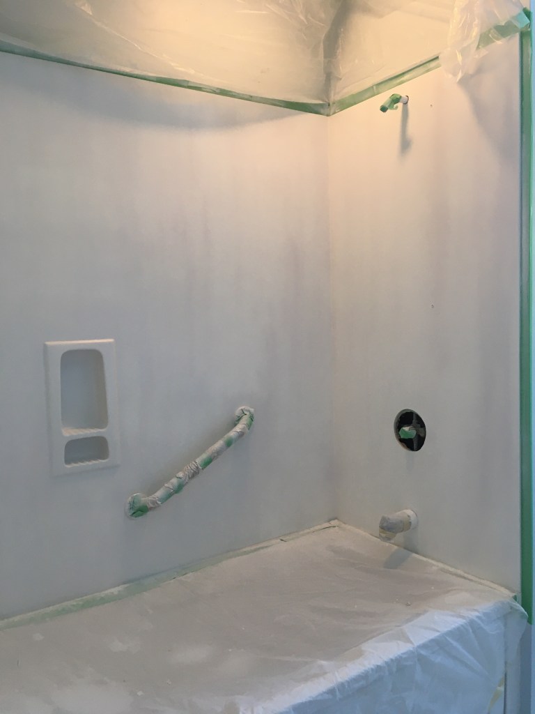 Dan sprayed 2 coats of the Appliance Epoxy and it looks pretty good for what it is. It’s a little splotchy and I do think another coat of the roll on stuff would have been better but since it will be hidden by a shower curtain anyway, I’m fine with leaving it as is.