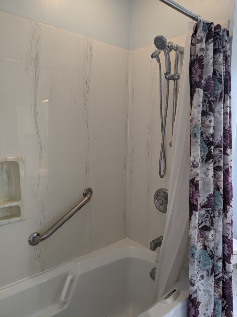 Before you say, “BUT IT’S NOT MEANT FOR SHOWERS!” We know. We’ll see if this holds up over time. We can always replace the tub surround down the road if it turns out to be a disaster. That’s why I wasn’t too concerned about taking the risk. Refinishing the existing surround was always an experiment in my mind.