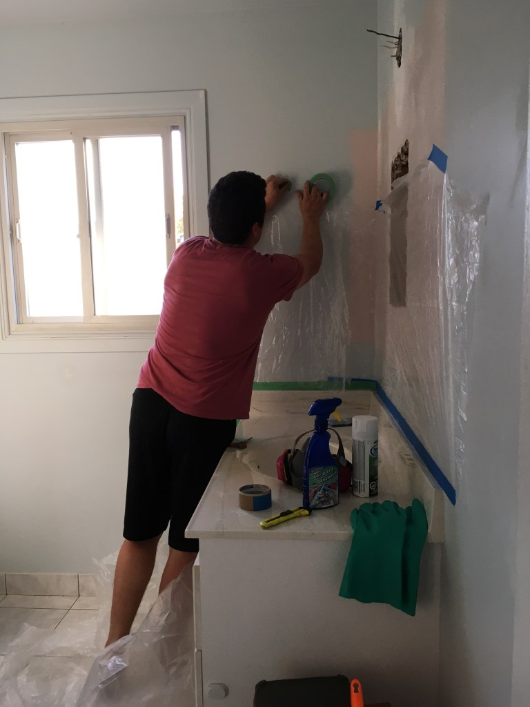 While waiting for the degreaser to completely dry, we spent what felt like forever taping around the surfaces and putting protective plastic up because I had been warned by many tutorials about the overspray.