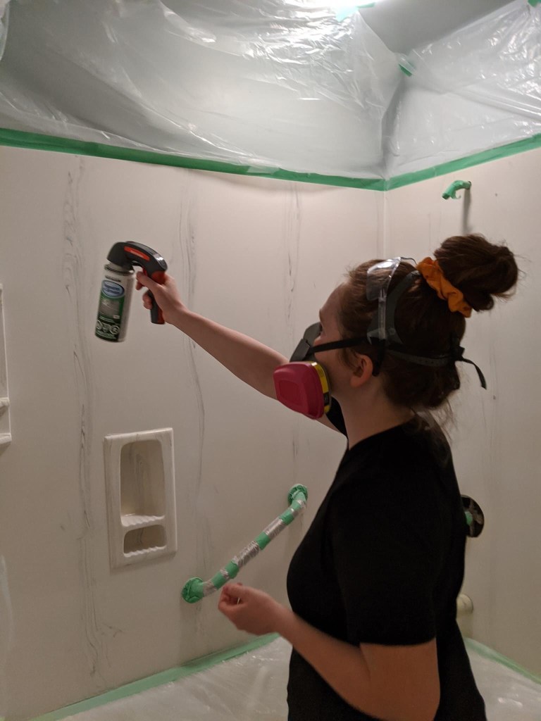 The tub surround went on a very different epoxy journey. I started with the same Rustoleum Tub & Tile Spray at first but quickly learned that the inconsistent spray lends itself easily to drip lines. It might not be the product, it could totally be the user. I used a Rustoleum Comfort Grip attachment to help with the angle and pressure to avoid my finger cramping but I knew that wouldn’t guarantee a smooth application.