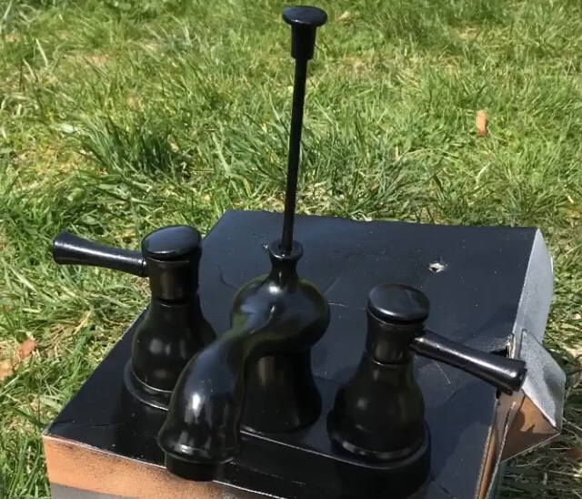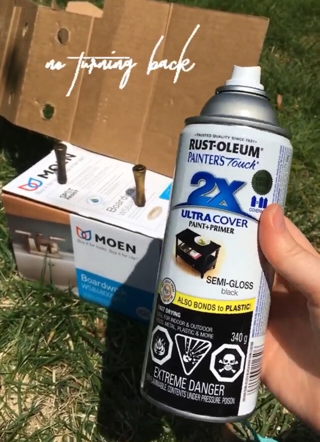 I was planning on spray painting my existing faucet anyway so I figured, why not try on this free one first? I used Rustoleum Painter’s Touch 2X spray paint in Semi-Gloss Black.