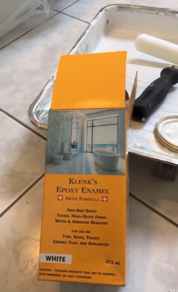 After one quick thin pass over of the tub surround with the spray I knew I would be moving on to the roll on alternative. There is a Rustoleum Tub & Tile kit that comes in paint cans but my sister had given me a similar product from a different company. She had picked up Klenk’s Epoxy Enamel for her own tub surround but then decided to replace the surround completely. Since she had no use for the epoxy anymore and completely replacing the surround isn’t in my $500 budget she gifted me with the Canadian made, Swiss Formula epoxy paint kit.