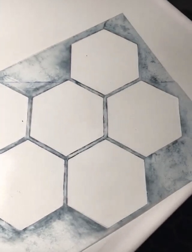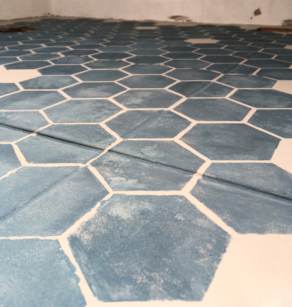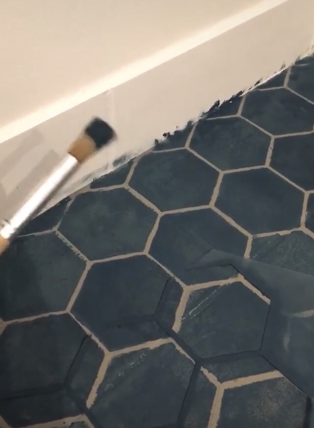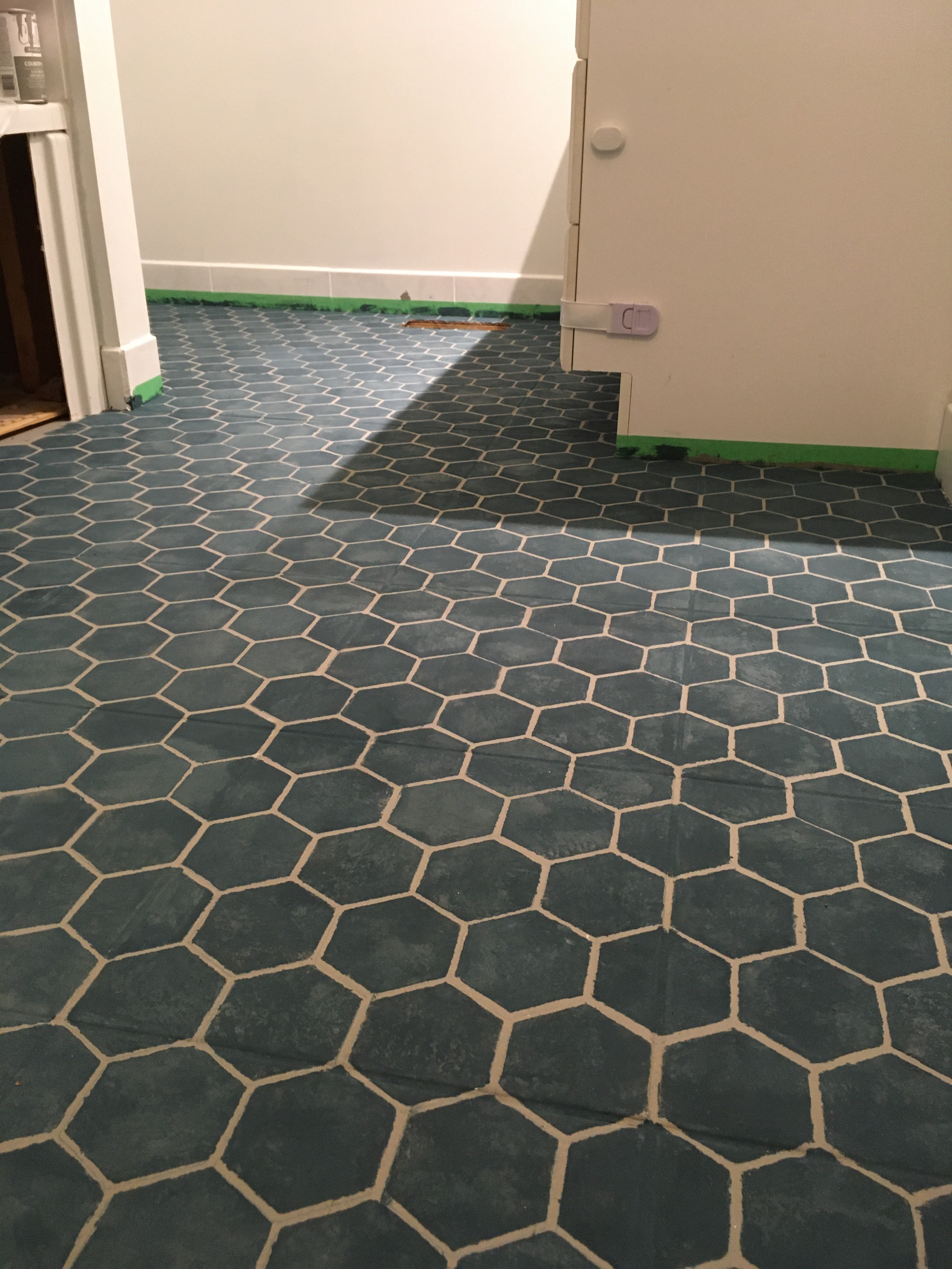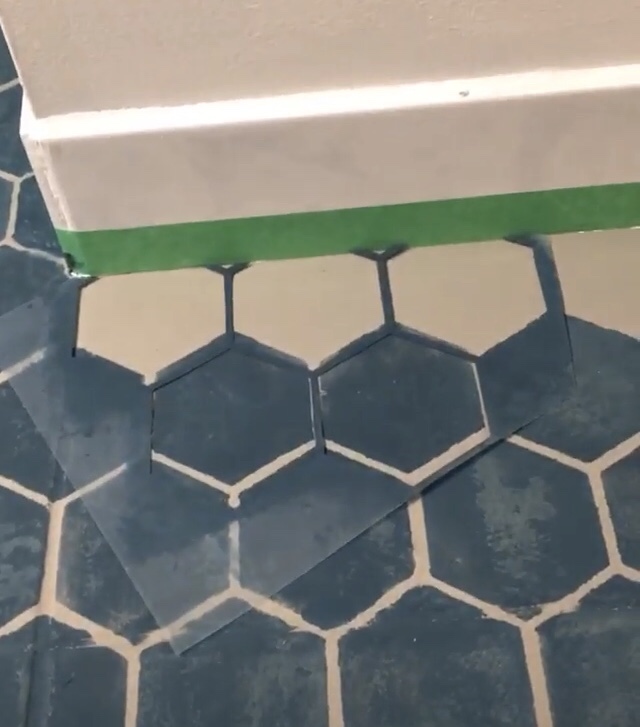 Since I only had one stencil to work with, I started with the wall edge that needed a line of near complete hexagons and cut my stencil accordingly. I had to use a small paint brush to reach the corner where the floor meets the wall because my small roller wasn’t doing the job.
