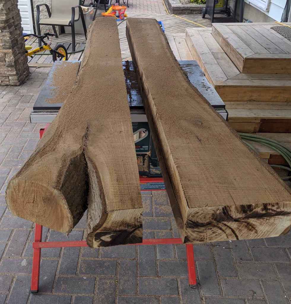 I always envisioned a wood beam mantel on our white brick fireplace and now that the offset stone shelves have been removed we can finally make that happen!