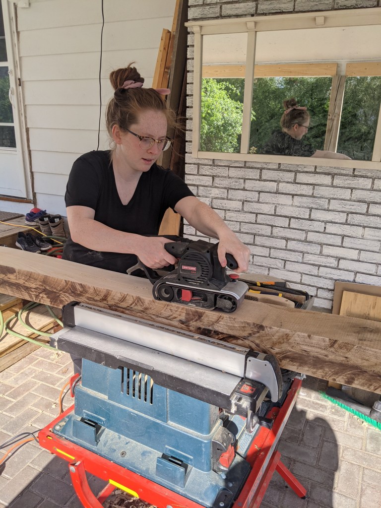 Then I sanded it down with a belt sander to smooth out the ridges on the top and bottom of the piece. I sanded the front of it by hand.