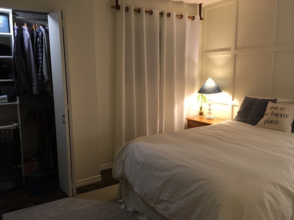 Maybe it’s because I don’t have a great track record with picking paint colours but I now like to play it a bit safe. I know it may be kind of boring, I love a nice white room. The Budget Room Refresh in our primary bedroom made me fall in love with the feeling of calm that washes over me when I enter a space that is free of clutter and is fresh, bright and white. Honestly, when I walk into my bedroom I feel tension release from my shoulders and I feel at peace. I think it’s partly because I know how the room used to make me feel at the end of a long day. Now that we’ve decluttered and downsized to one shared dresser, we have space to move and breathe and everything has a place. This room used to feel so crammed. Minimizing our wardrobe and maximizing the closet space helped a lot with that.