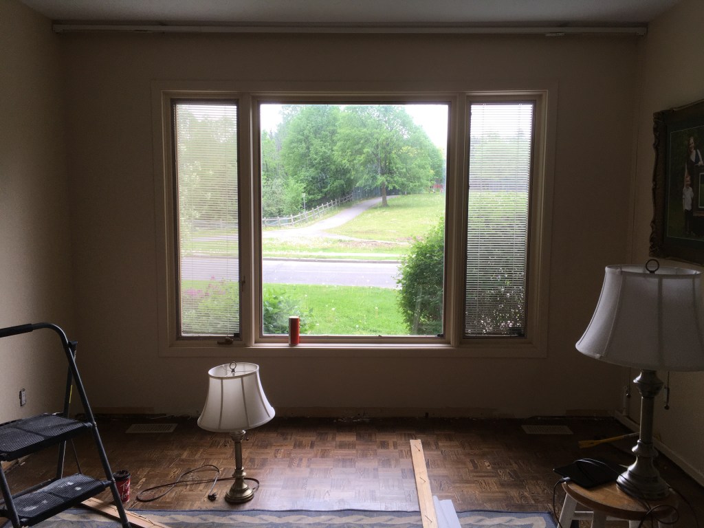 Then there were also the windows that have a removeable pane to access the built-in blinds. I wanted to finally remove those to maximize the light into the room. Since the windows were already out I figured I’d take this opportunity to spray paint the metal frames black. Taping off and covering with protective plastic was pretty time consuming but so worth it.