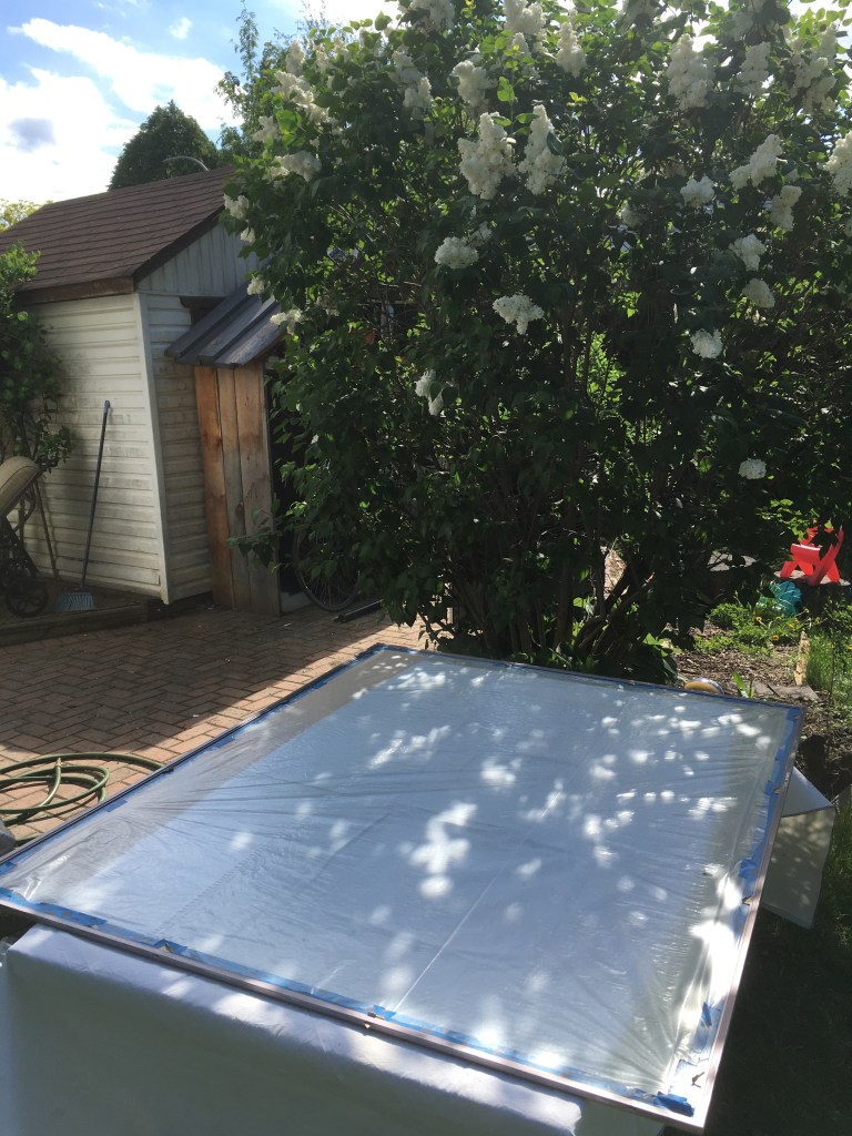 While they rolled, I spray painted the windows outside. I’m proud to say I didn’t go too heavy with the spray paint this time; I finally learned to do a few light coats instead of one heavy drippy one.