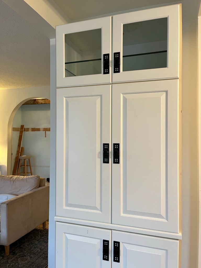 I’ve had to bring a coat stand from one room to the living room so we still have somewhere to hang coats. I bought other cabinets to contain our pantry goods temporarily, one in the front entrance and one in the kitchen, but those will eventually go down to our basement on either side of our TV. We’ve had to find other places for our broom and vacuum. It feels uncomfortable to have all these things in spots where they don’t belong. It’s honestly a mess.